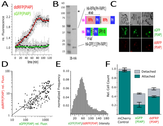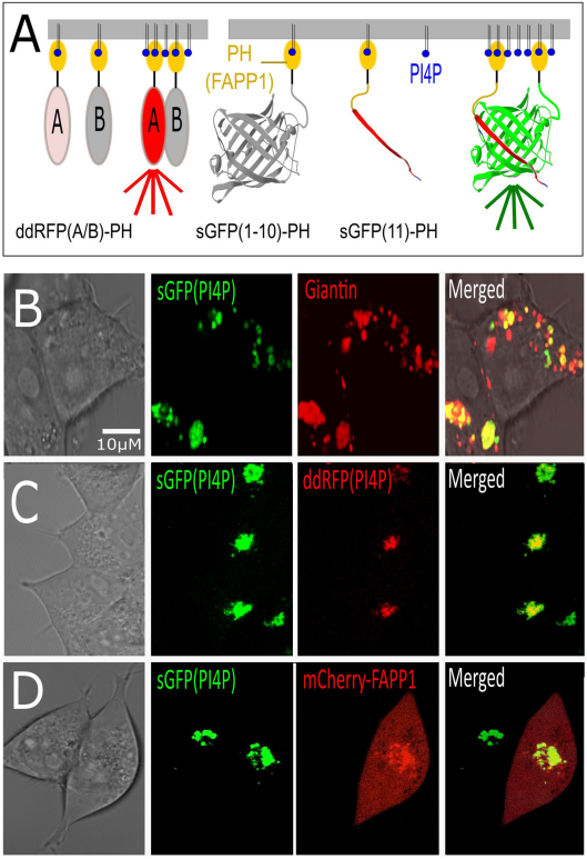 为突破这一限制,Samantha K. A. Manuel等研究团队在《Scientific Reports》发表的研究中,创新性地将分裂GFP(sGFP)技术应用于代谢物传感领域。研究人员设计了两类PI4P传感器:沿用传统思路的ddRFP(PI4P)和首创的sGFP(PI4P),均采用FAPP1的PH结构域作为靶向模块。通过系统比较发现,虽然ddRFP(PI4P)在分钟级响应上表现优异,但sGFP(PI4P)在稳定表达条件下展现出56倍的信号强度优势,且能在极低表达水平下维持功能,显著降低了对细胞行为的干扰。这种性能差异源于两种传感器的不同工作原理:ddRFP依赖瞬时相互作用产生信号,而sGFP通过PI4P介导的片段互补形成稳定荧光结构,具有"慢开-慢关"的独特动力学特征。
