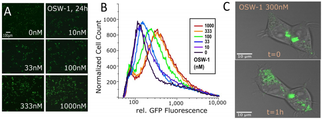 "sGFP(PI4P)稳定表达的检测优势"展示了该传感器在实际应用中的多重价值:不仅能通过流式细胞术定量OSW-1剂量效应,还能清晰显示药物诱导的高尔基体结构紊乱,同时保持低背景干扰。