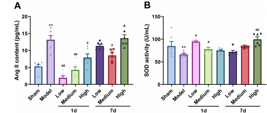 通过ELISA检测发现,I/R损伤后血清Ang II显著升高而SOD活性降低。Ang-(1-7)治疗1天即可剂量依赖性降低Ang II水平,同时提升SOD活性,其中高剂量组(576 μg/kg)效果最显著。