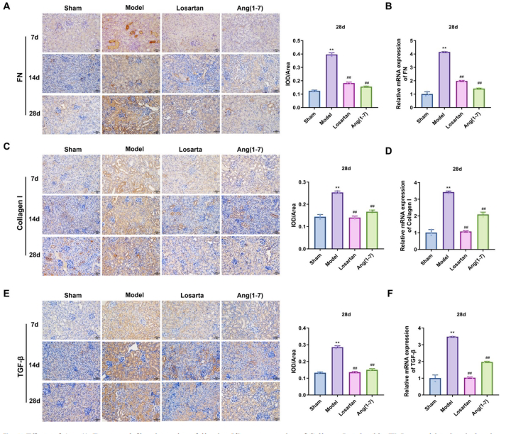 免疫组化显示I/R损伤显著上调胶原蛋白I(Collagen I)和转化生长因子-β1(TGF-β1)表达。Ang-(1-7)治疗组中,高剂量组在第7天即表现出显著的抗纤维化效果,胶原沉积减少40%以上。