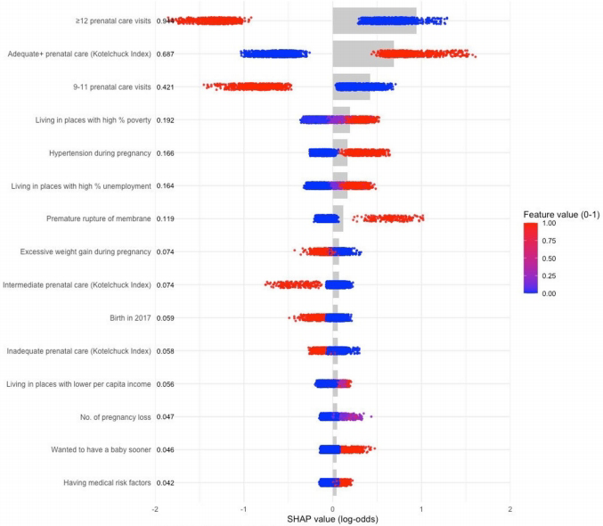 为破解这一难题,Sangmi Kim团队在《BMC Pregnancy and Childbirth》发表研究,创新性地将机器学习与解释性分析相结合。研究整合了美国9个州2016-2021年的妊娠风险评估监测系统(Pregnancy Risk Assessment Monitoring System, PRAMS)数据与社会脆弱性指数(Social Vulnerability Index, SVI),纳入9,595例初产妇女(NHB 3,206例,NHW 6,389例)。通过Elastic Net、随机森林和XGBoost三类算法建模,并采用SHAP(SHapley Additive exPlanations)值量化特征重要性。