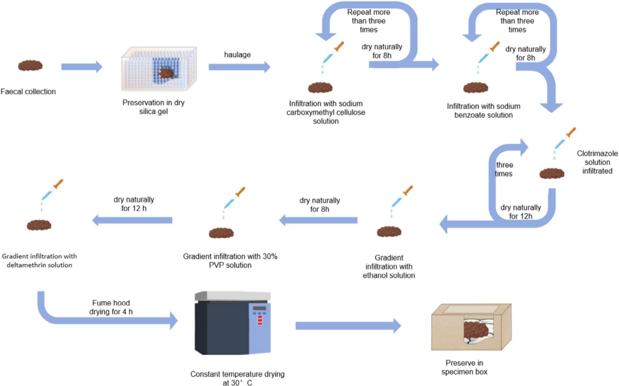 野生动物粪便是生态学和保护生物学中常用的非侵入式样本,可用于物种识别、种群监测、遗传分析以及环境与健康相关研究。然而,在实际应用中,粪便样本的利用仍以短期、一次性分析为主。现有保存方法如冷冻、酒精浸泡或硅胶干燥,主要针对DNA提取需求,较少兼顾粪便外部形态和化学组成的长期稳定保存。这种策略限制了样本的后续利用:野外调查中粪便形态识别高度依赖经验判断,缺乏经过遗传信息验证、可长期保存的实物参照;同时,样本难以长期留存和重复检测,使跨年度、跨项目甚至回溯性的比较分析缺乏稳定物质基础。