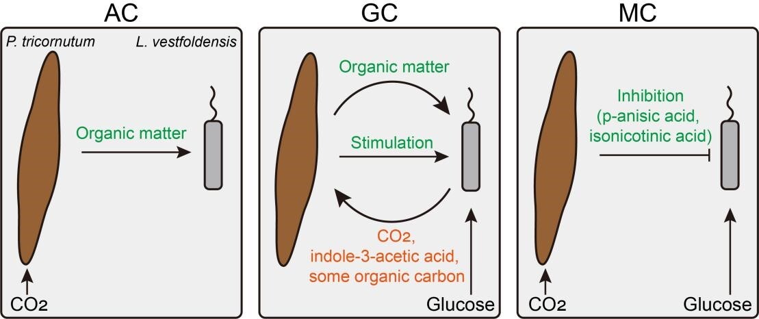 针对这一问题,中国科学院水生生物研究所胡晗华研究团队揭示了模式专性光合自养硅藻三角褐指藻(Phaeodactylum tricornutum)与杆状细菌福尔山洛克式菌(Loktanella vestfoldensis)之间密切的相互作用关系,及其在硅藻碳适应机制中的重要作用。具体而言,当葡萄糖作为唯一碳源(GC)时,硅藻的生长依赖福尔山洛克式菌提供必要的碳源支持;当二氧化碳作为唯一碳源(AC)时,福尔山洛克式菌的生长则依赖于三角褐指藻;而在混合碳源(MC)条件下,二者呈现竞争关系,三角褐指藻优先利用无机碳,同时通过分泌抗菌物质(如对甲氧基苯甲酸、异烟酸等)抑制福尔山洛克式菌的生长。