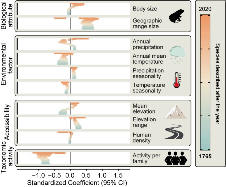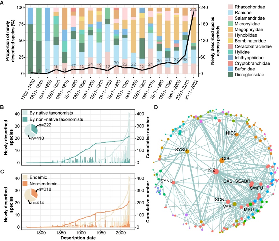 基于此,中国科学院成都生物研究所胡军华研究员团队系统梳理了 1765 至 2022 年间中国两栖动物的物种发现全貌,解析了物种发现过程的时空规律、驱动因素及现存挑战,通过模型预估了未来最有可能发现新物种的“热点区域”,并揭示了驱动物种发现的核心力量,为后续分类学研究与生物多样性保护提供了关键的科学依据。