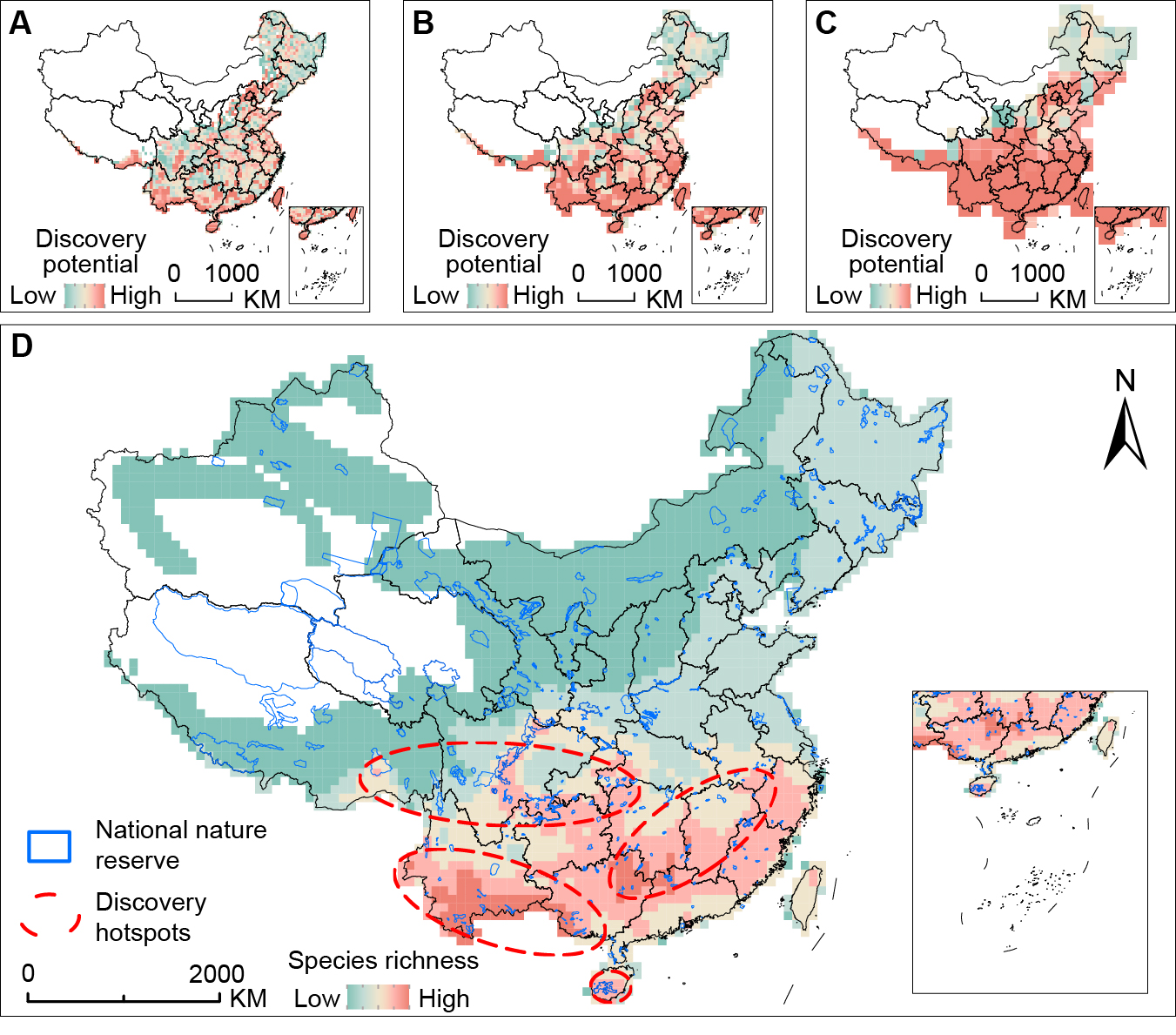 对物种发现概率进行量化分析表明,影响物种发现概率的因子在不同时间段的方向和作用程度有所变化,但分类学活动一直是最主要、最稳定的驱动因素。其中,本土分类学家活跃度是推动发现的主要促进因素(图5)。研究进一步绘制了中国未来两栖动物发现的潜在热点区域。物种发现热点地区主要集中在西南山地与岛屿地区(如贵州、湖南、云南、西藏、广西、广东、海南及云南—越南/缅甸边境山地),多数热点与现有保护地存在重叠,但东南部地区仍存在保护空缺(图6)。