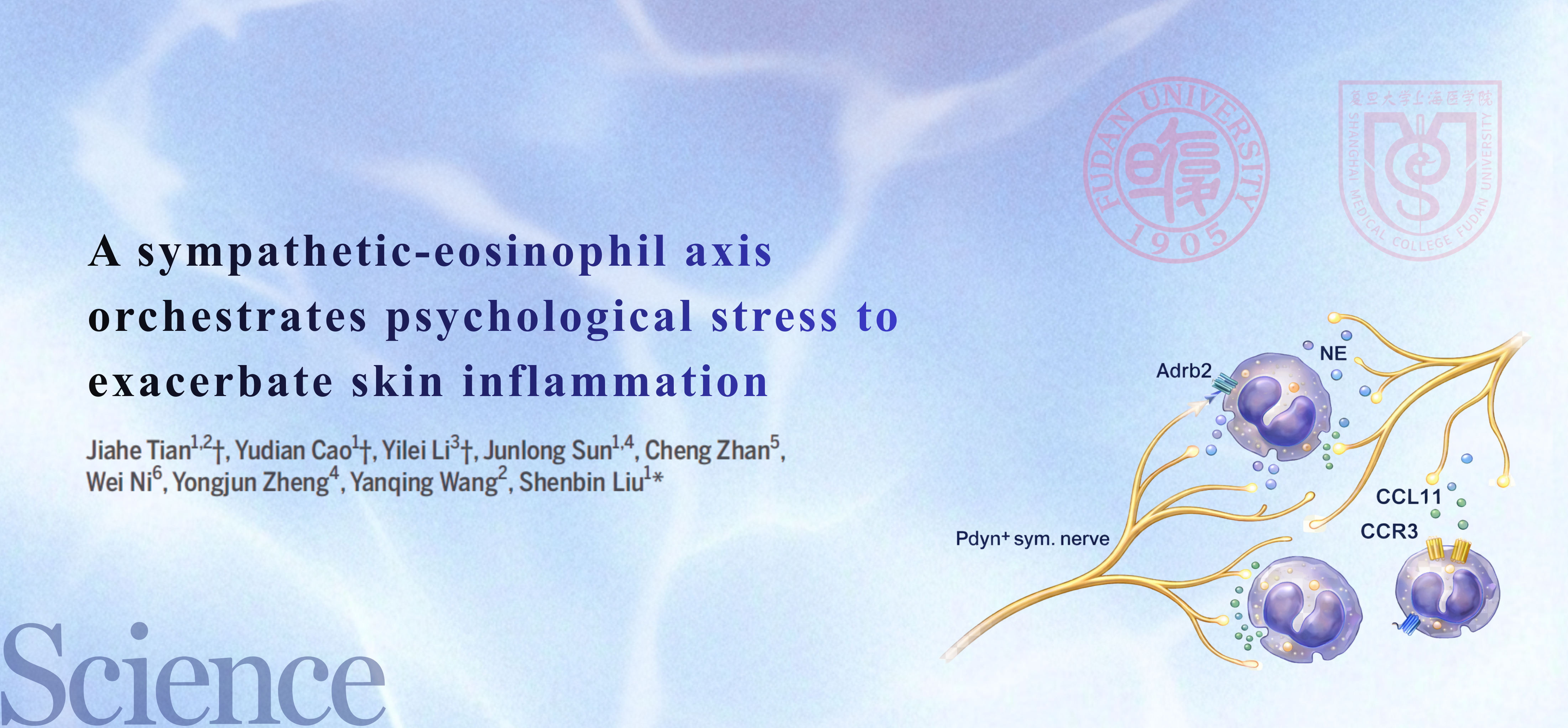北京时间2026年3月20日,复旦大学脑科学研究院/脑功能与脑疾病全国重点实验室、脑科学前沿科学中心青年研究员柳申滨团队在《科学》(Science)杂志上发表题为《交感神经-嗜酸性粒细胞轴介导心理应激加剧皮肤炎症》( “A sympathetic-eosinophil axis orchestrates psychological stress to exacerbate skin inflammation” )的研究论文,系统揭示了大脑应激信号经由特定轨道的皮肤交感神经募集并激活嗜酸性粒细胞,进而触发炎症级联放大效应的神经免疫学基础。