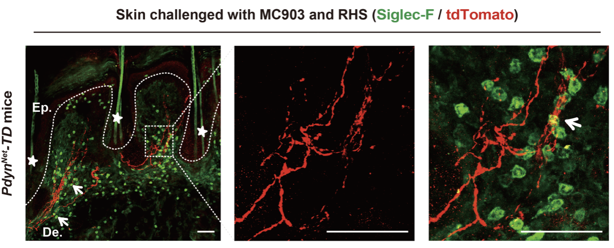 图2:RHS处理后,特应性皮炎小鼠皮肤中的Pdyn+交感神经纤维(tdTomato+,红色)与嗜酸性粒细胞(Siglec-F+,绿色)呈现紧密的空间毗邻关系。