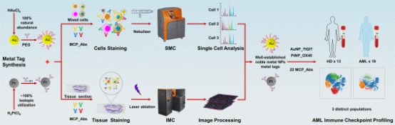 图3贵金属纳米颗粒标签协同常规MCP标签进行AML免疫检查点研究