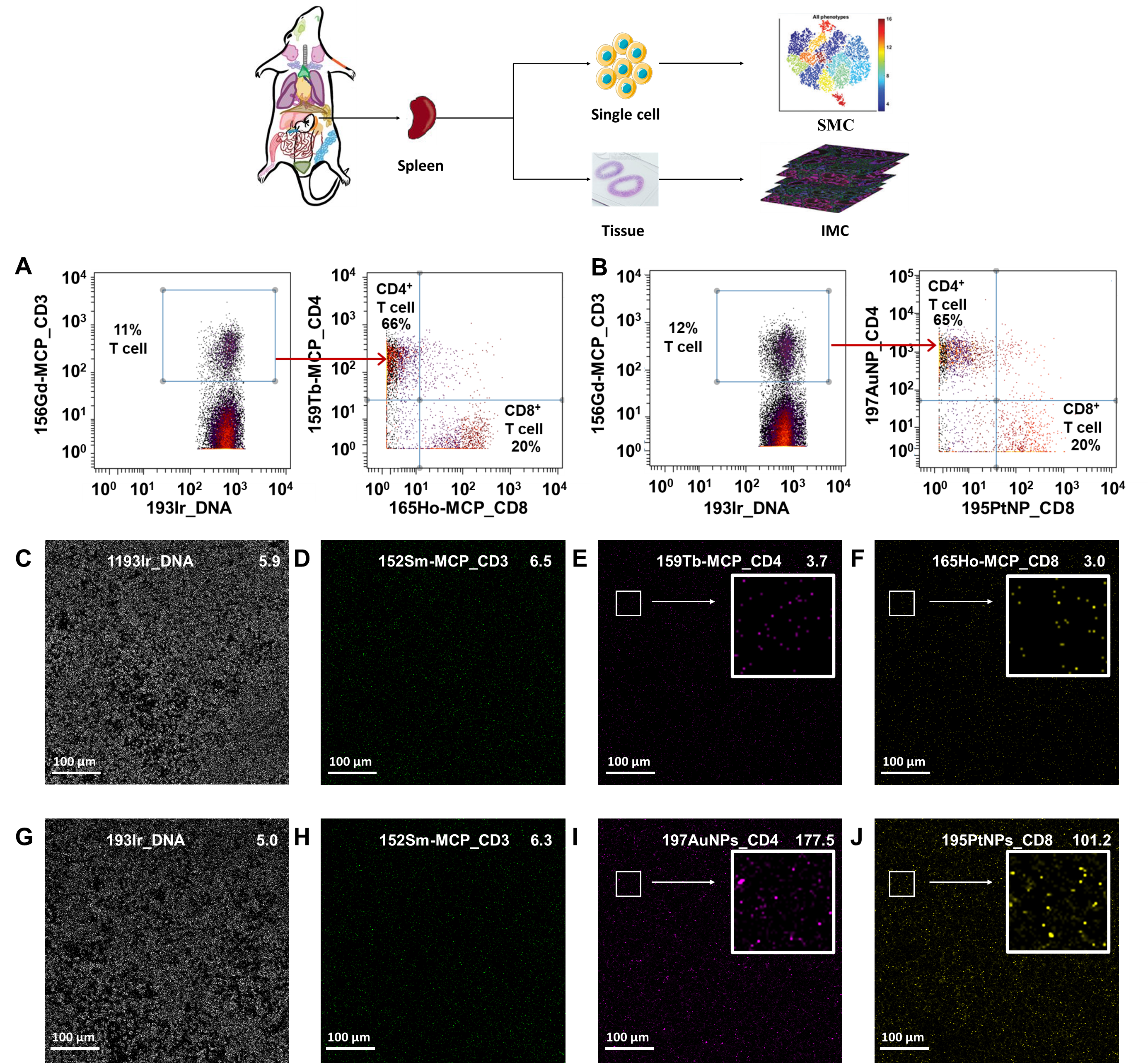 图2贵金属纳米颗粒标签用于小鼠脾脏单细胞及组织成像质谱流式双重检测