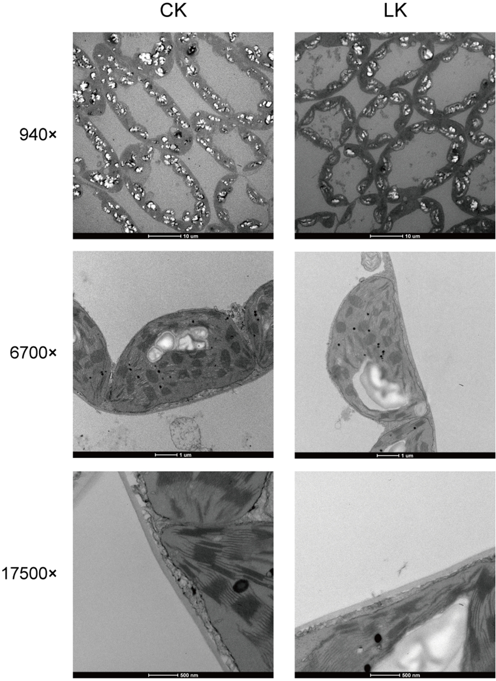 图1 研究中番茄对照组和缺钾叶片的叶肉细胞超显微结构图。