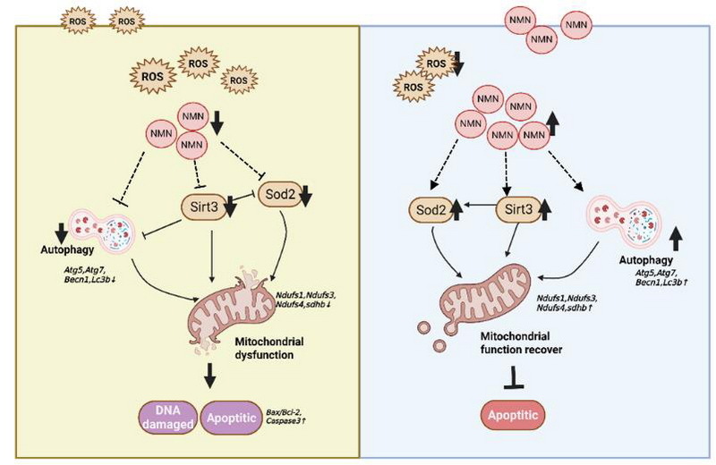 文章模式图:胚胎期低氧通过 Sirt3/sod2 通路导致卵母细胞氧化应激损伤,而烟酰胺单核苷酸添加可以部分恢复卵母细胞及卵巢功能