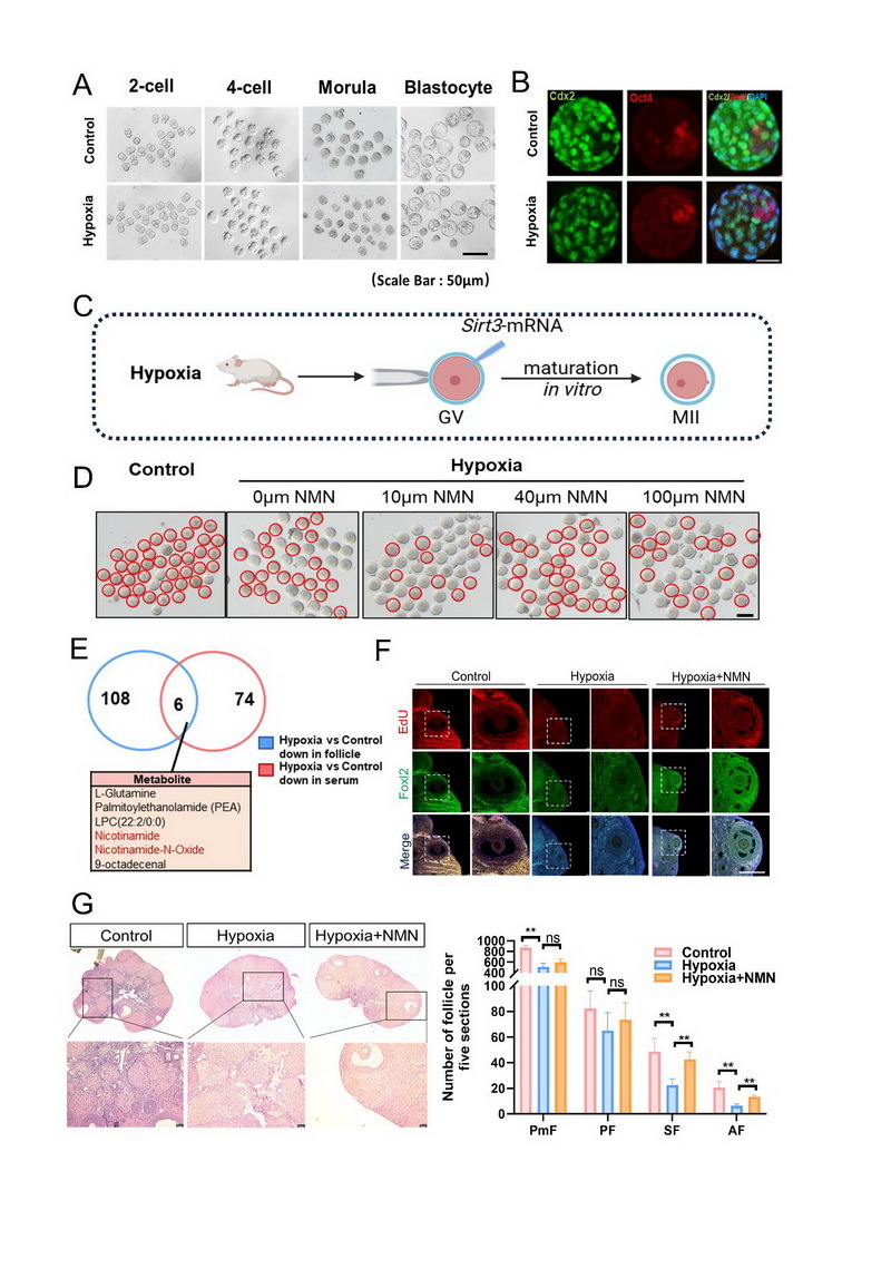 文章代表图:(A)对照组与低氧组 2-细胞、4 -细胞、桑椹胚及囊胚期小鼠胚胎代表图片(标尺:50 μm)。(B)对照组与低氧组囊胚中滋养层细胞标记物 Cdx2(绿色)、内细胞团标记物 Oct4(红色)及核标记 DAPI(蓝色)的免疫荧光共定位结果。(3)Sirt3 mRNA显微注射低氧GV 期卵母细胞,进行Sirt3过表达实验。 (D) 对照组及低氧组卵母细胞在不同浓度 NMN 体外处理后的成熟情况对比(红色圈标记成熟卵母细胞,标尺:50 μm)。(E)低氧组与对照组卵泡液及血清中差异代谢物的交集分析,下方列出 6 个核心重叠差异代谢物。(F)对照组、低氧组及低氧 + NMN 组卵巢组织中增殖标记物 EdU(红色)、颗粒细胞分化标记物 Foxl2(绿色)及 Merge 图的免疫荧光结果(白色虚线框为局部放大区域,标尺:200 μm)。(G) 卵巢组织形态学分析与卵泡计数:对照组、低氧组及低氧 + NMN 组卵巢组织 H&E 染色结果(左图,标尺为400 μm);各组原始卵泡(PmF)、初级卵泡(PF)、次级卵泡(SF)及有腔卵泡(AF)在 5 张连续切片中的数量统计(右图)。
